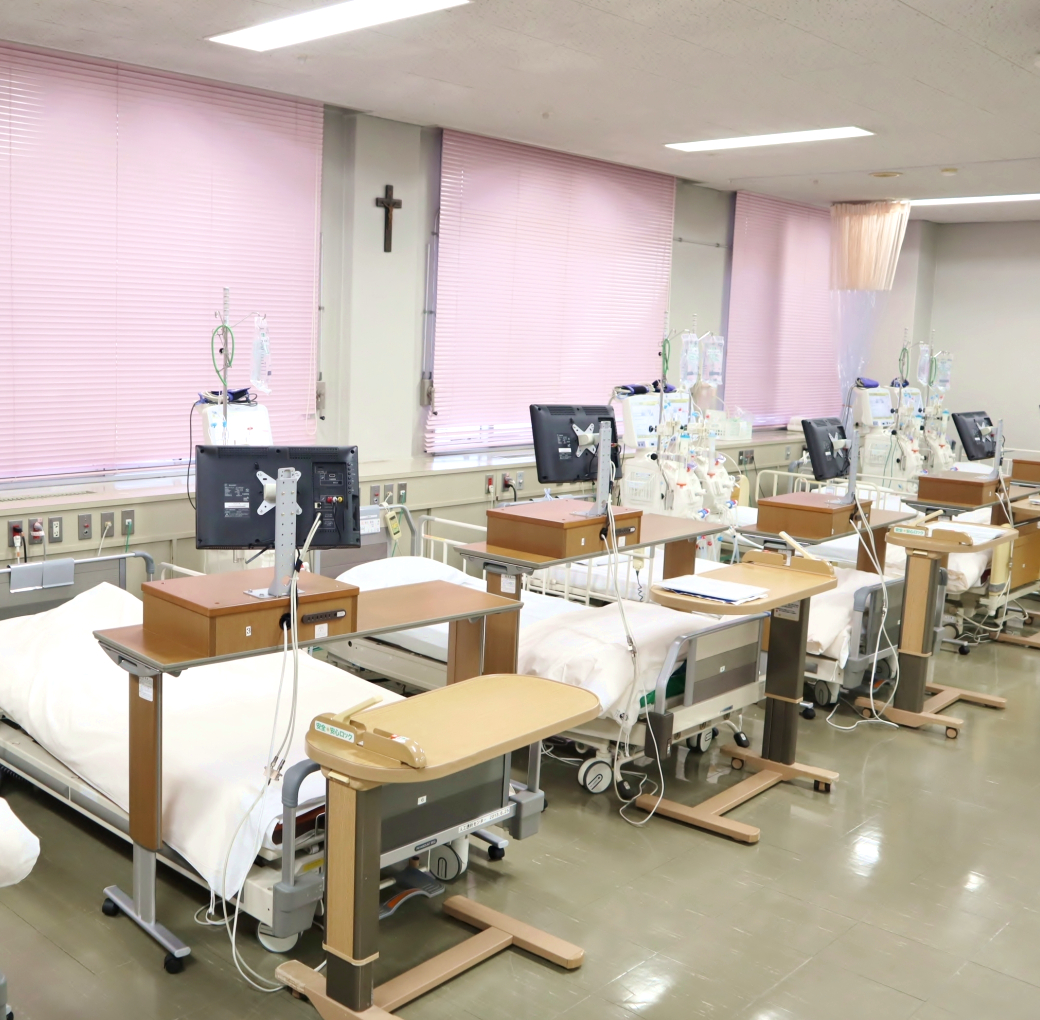 透析治療は、患者さんの体の状態や病気の進行度合いによって、必要なケアが変わってきます。当院は、様々な診療科が集まる総合病院です。この強みを活かし、透析治療だけでなく、患者さん一人ひとりの「今」に合わせた治療を提供できるよう、専門の医師が連携して対応できる体制が整っています。