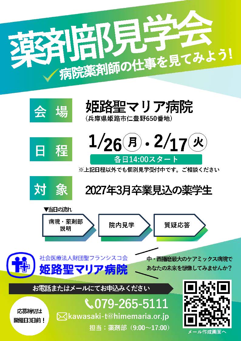 | 日時 | 2026.1/26(月) 2/17(火) 14:00~ E-Mail:kawasaki-t@himemaria.or.jp Tel:079-265-5111(代) |